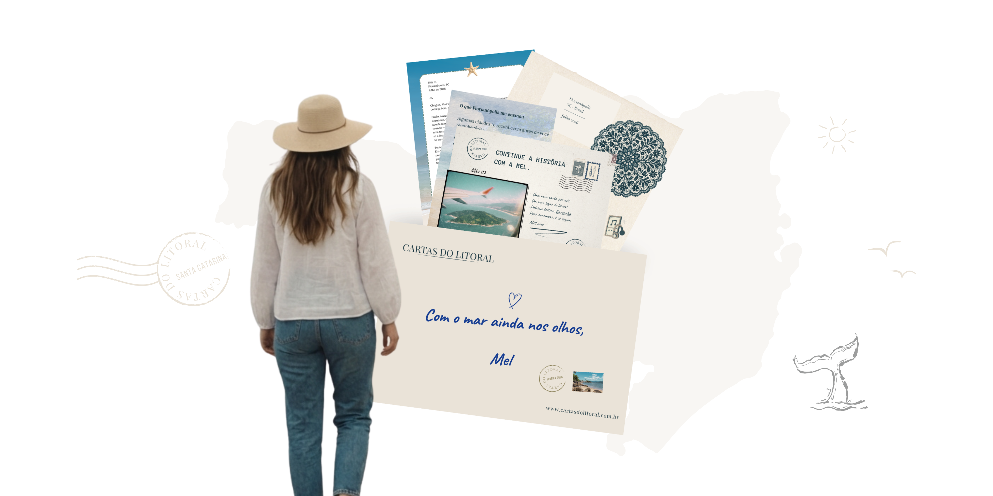 Uma experiência de correspondência física. Cada mês, Mel escreve de um lugar diferente do litoral Catarinense — e a carta chega até você pelo correio.